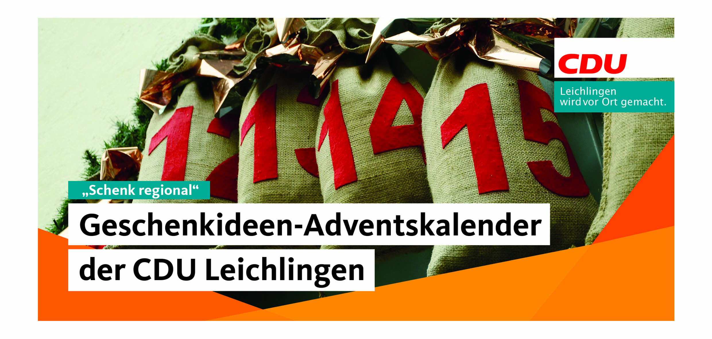 Wir freuen uns über Anregungen zu Leichlinger Anbietern, deren Produkte oder Dienstleistungen wir in den Kalender aufnehmen können. Jeder kann Ideen für lokale Geschenke per E-Mail an winter [at] cdu-leichlingen.de oder telefonisch unter 0163 8732302 vorschlagen.